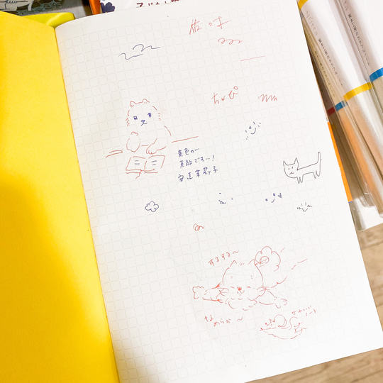 ひるねこBOOKSさんのお試し書きノートより。イラストレーターの西藤燦様がイラストとコメントを残してくださいました。「ドローイングペンでぐりぐり描いてもすぐにかわいて描きやすいよ。インク染みのできない。」